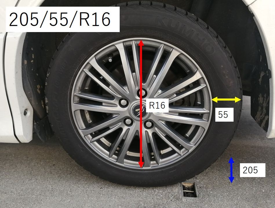 写真のタイヤのサイズは205/55R16になります。数字の意味は「タイヤ幅/扁平率/インチ」です。