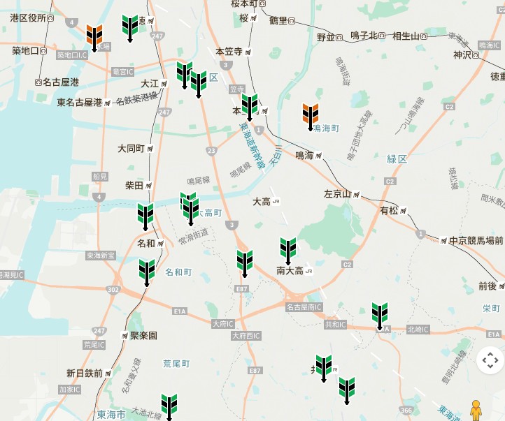 郵便番号を入力すると最寄りの交換可能なガソリンスタンド(緑)とオートバックス(オレンジ)が表示されます。