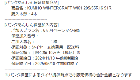 保証については別途料金で1年保証以上の契約ができますが、サマータイヤとスタッドレスタイヤを履き替える人は6カ月の保証で十分かなと思います。タイヤを履き替えるときに点検すれば、無料の6カ月保証も1年保証も変わらないですからね。