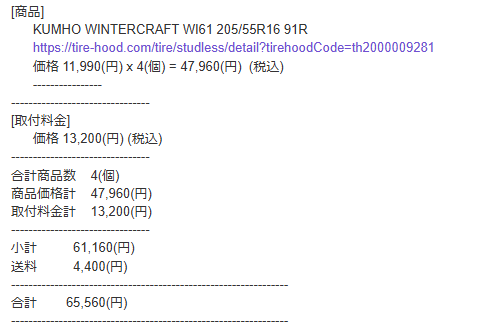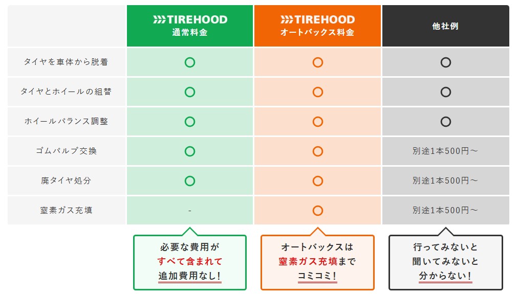 楽天などでもタイヤ交換の対応をしているところもありますが、購入方法が分かりにくく、別途料金になっている項目もあり、最終価格がいくらになるのか分かりにくいですが、タイヤフッドはすべてコミコミの価格になるので、追加料金は発生せずに安心して買えました。