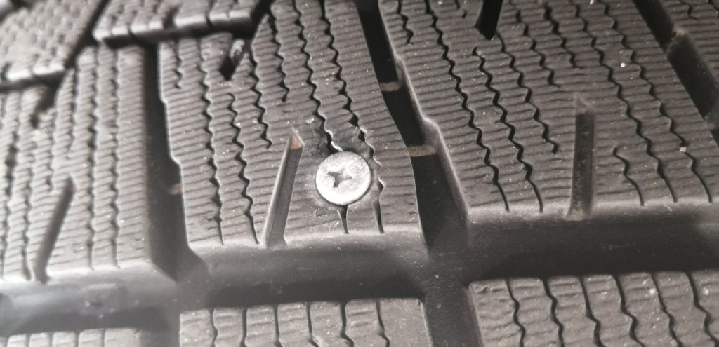 11月にタイヤ交換して、タイヤ減ってるかなーと思ってちらっとタイヤを見たらビスが刺さっているのを発見しました。おそらく短いビスで内部までは達していないと思われますが、タイヤ保証を申請したら交換できました。