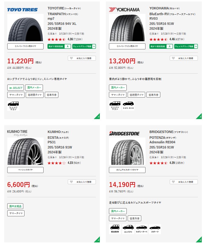 - タイヤの種類が豊富(サマータイヤは多いが、スタッドレスは少し減ります)